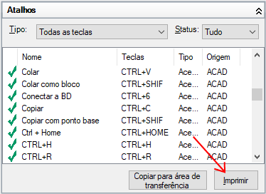 - No painel Atalhos, filtre o tipo e o status dos atalhos de teclado a serem impressos.