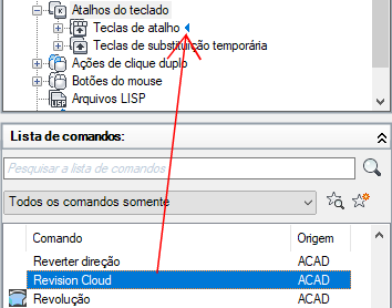 - Para criar uma tecla de atalho, no painel Lista de comandos, arraste um comando para o nó Teclas de atalho, no painel Personalizações em <nome do arquivo>.