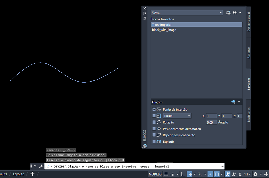 Você já precisou colocar objetos espaçados por igual ao longo de outro objeto ou colocar objetos em intervalos específicos ao longo de outro objeto? Digamos que você precise colocar várias postes de luz espaçados por igual ao longo de uma rua. Para concluir a tarefa, você avaliou o comprimento da rua, fez algumas contas e então descobriu a distância que cada poste de luz precisa estar. Mas há uma maneira mais rápida! Vamos dar uma olhada em como usar DIVIDIR e MEDIDA para dividir um objeto por igual ou com base em um intervalo específico, e colocar pontos ou blocos ao longo de um objeto.