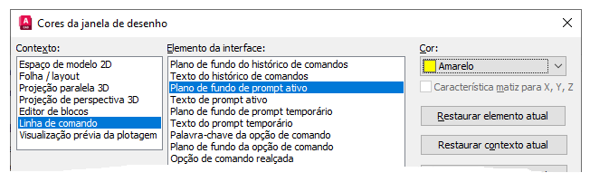 Na caixa de diálogo Cores da janela de desenho, em Contexto, escolha Linha de comando.