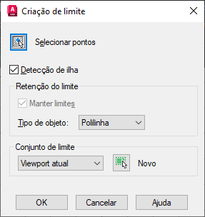 A caixa de diálogo Criação do limite exibe com várias opções. As configurações padrão são a melhor opção na maioria dos casos. Certifique-se de que o tipo de objeto esteja definido como Polilinha.