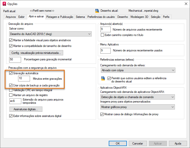 Nota: Tenha cuidado ao definir um intervalo de tempo muito grande. Se você não salvar com frequência, correrá o risco de perder muito trabalho que deverá ser refeito se estação de trabalho ou o programa encerrarem inesperadamente.