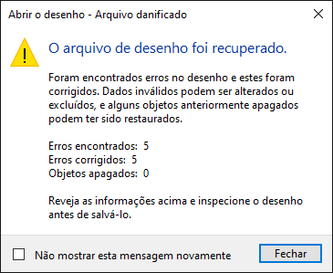Se o desenho aberto contiver erros, o número de erros encontrados e corrigidos será exibido junto com o número de objetos apagados porque não puderam ser corrigidos.