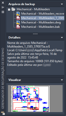 Dica: Também é possível renomear e abrir os arquivos BAK e SV$ fora do Gerenciador de recuperação de desenho. Consulte a seção Arquivos de desenhos de backup e do salvamento automático, acima neste tópico.