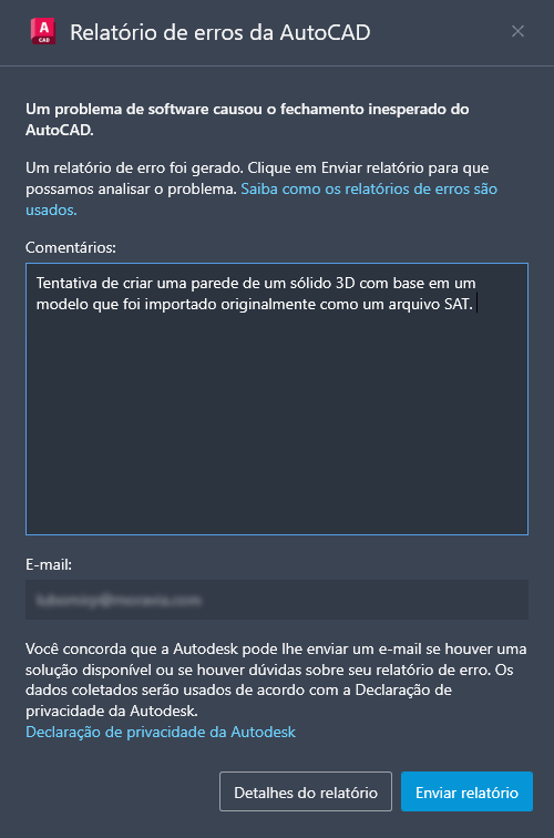 Após salvar todos os desenhos abertos com alterações não salvas, a caixa de diálogo Relatório de erros do AutoCAD deverá ser exibida. Nessa caixa de diálogo, é possível nos enviar um relatório de erros. O relatório de erros inclui informações sobre o estado atual do programa e da estação de trabalho e pode incluir informações opcionais, como o que você estava fazendo no momento do erro. Os relatórios de erros são usados para melhorar a estabilidade do produto.