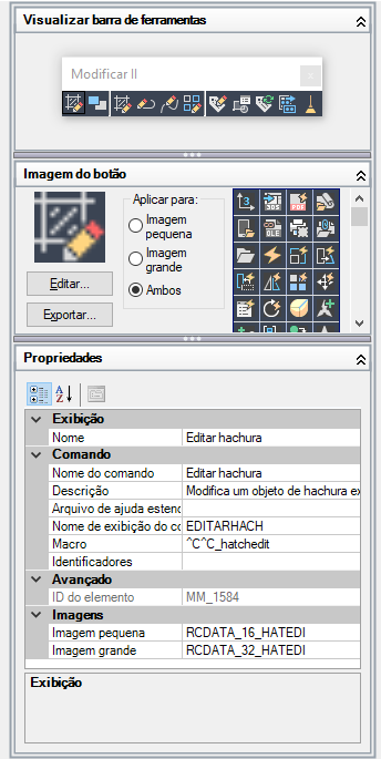 O painel Exibição dinâmica mostra uma visualização prévia do elemento da interface do usuário selecionado no painel Personalizações em. Permite editar a imagem de um comando selecionado no painel Lista de comandos e as propriedades específicas do item selecionado no painel Personalizações em ou no painel Lista de comandos.