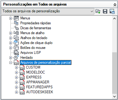 O painel Personalizações em é usado para navegar pelos diferentes elementos da interface do usuário que estão nos arquivos de personalização carregados.