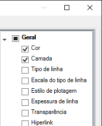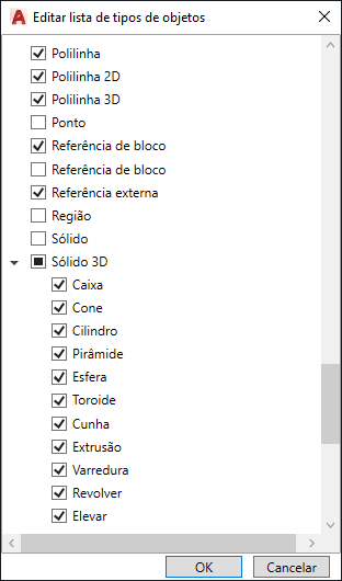 Se um tipo de objeto estiver marcado, as propriedades desse tipo de objeto são exibidas na paleta Propriedades rápidas quando um objeto do mesmo tipo estiver selecionado e quando QPMODE estiver definida como 2 e PICKFIRST estiver ativada. Limpe a marca de seleção junto a um tipo de objeto para remover o tipo de objeto selecionado da paleta Propriedades rápidas.