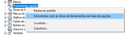 - Na guia Personalizar interface do usuário, no painel Personalizações em <nome do arquivo>, selecione Propriedades rápidas.
