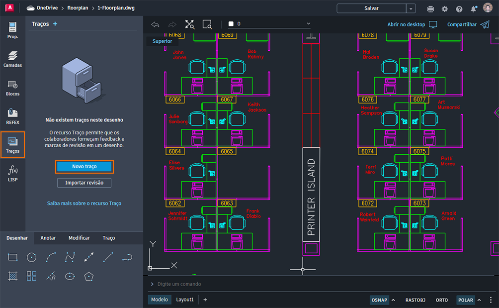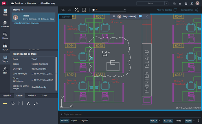 Os recursos COMPARTILHAR (Compartilhar URL) e Traço fornecem novas formas de colaborar com colegas e economizam tempo ao trabalhar com vários colaboradores com diferentes acessos ao AutoCAD.