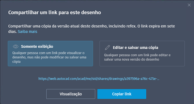 COMPARTILHAR empacota o arquivo e todas as suas referências como um URL que pode ser aberto no aplicativo Web do AutoCAD. Qualquer pessoa com o link poderá abrir o desenho na Web. O link expira após sete dias.