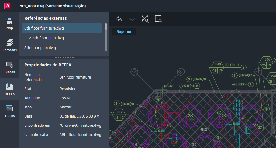 Os desenhos de somente visualização são rotulados como "Somente visualização" e você notará que as ferramentas Salvar, Plotar e Desenhar foram desativadas. Se o desenho foi compartilhado com permissões de edição e salvamento, quando o usuário salva o desenho em uma localização especificada, quaisquer referências anexadas ao desenho serão salvas na mesma localização.