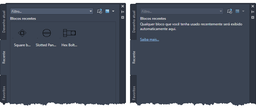 A guia Recentes da Paleta de blocos exibe instantâneos dos blocos recentemente inseridos ou criados no desenho atual. É possível sincronizar os blocos recentes em um desenho com um local de armazenamento na nuvem e acessá-los em qualquer dispositivo usando a área de trabalho do AutoCAD ou o