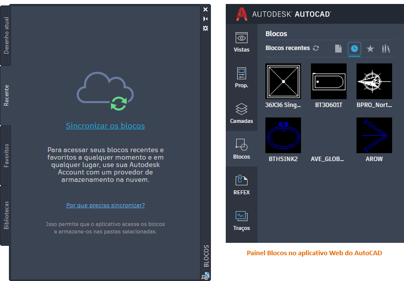 aplicativo Web do AutoCAD. Clique em Sincronizar os blocos, entre em sua Autodesk Account e, em seguida, especifique uma localalização de armazenamento na nuvem para iniciar a sincronização dos blocos.