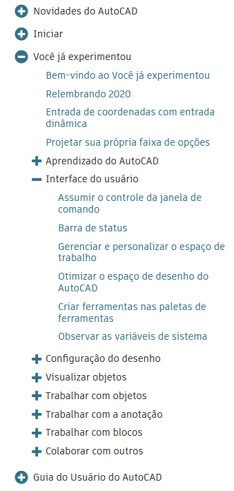 A Ajuda do AutoCAD tem um novo menu de Referências rápidas, os artigos “Você já experimentou” agora estão organizados em um índice e um novo formato de cartão fornece acesso mais fácil aos vídeos de aprendizagem.