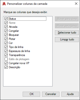 Define quais colunas são exibidas no Gerenciador de propriedades de camada para as guias Modelo ou layout atuais.