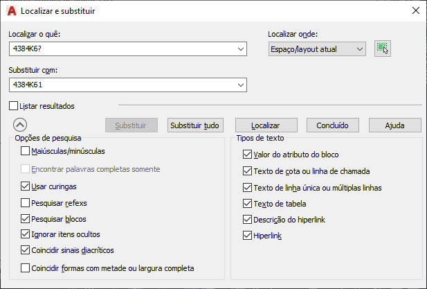 Por exemplo, se você tiver diversas peças parecidas no desenho, mas precisar alterar todas elas para 4384K61, insira 4384K6? na caixa Localizar e 4384K61 na caixa Substituir.