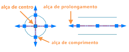 As alças permitem a manipulação direta das marcas de centro e linhas de centro. Neste exemplo, as linhas de centro no círculo são modificadas individualmente. Quando você arrasta a alça de comprimento, ela ajusta o comprimento da linha de centro e a extensão da linha de centro se move junto com ela. Mas arrastando a alça de prolongamento, controla somente a extensão da linha de centro.