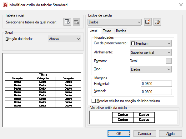 Controla o espaçamento entre a borda da célula e o conteúdo da mesma. Os ajustes de margem de célula são aplicados a todas as células da tabela. O ajuste padrão é 0.06 (imperial) e 1.5 (métrico).