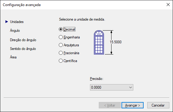 O assistente Advanced Setup contém cinco páginas: Units, Angle, Angle Measure, Angle Direction e Area. Ao trabalhar nesse assistente, escolha Back e Avançar para navegar nas telas. Para fechar o assistente e criar o novo desenho com as configurações especificadas, escolha Finish na última tela.