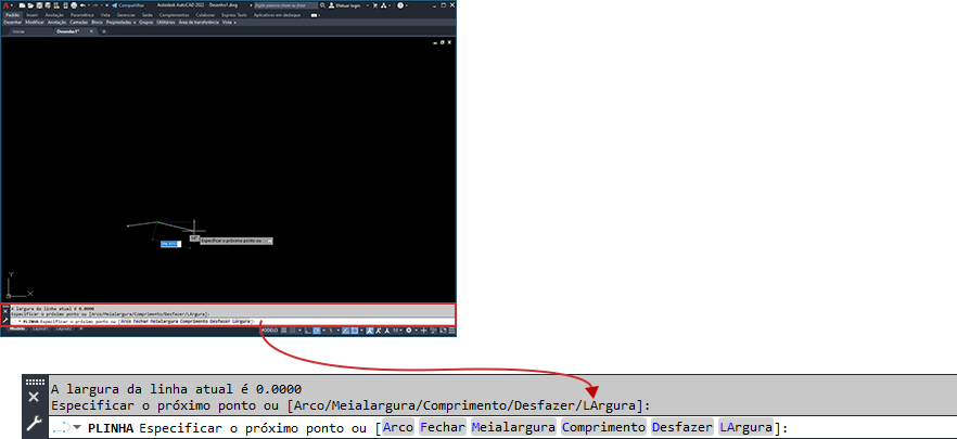 ). Ao ocultar a janela de comandos, você ainda pode inserir comandos na dica de ferramenta de entrada dinâmica. No entanto, alguns comandos e variáveis de sistema retornam valores na linha de comando, para que você possa exibi-la novamente nestas instâncias.