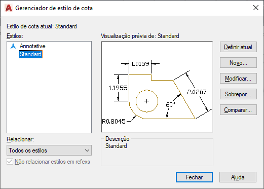 Exibe o nome do estilo de cota atual. O estilo predefinido de cota é PADRÃO. O estilo atual é aplicado para as cotas que você criou.
