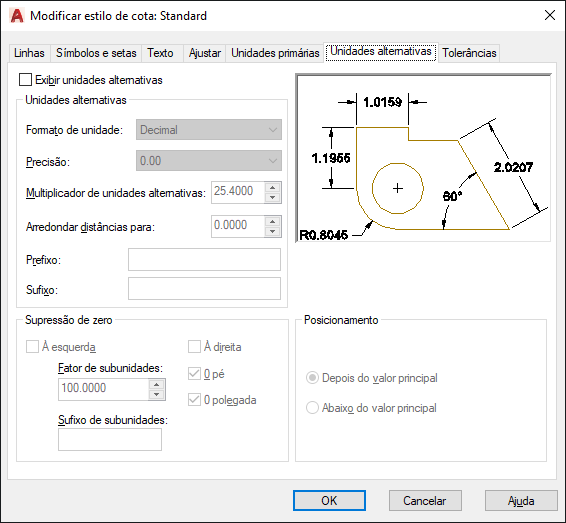 Especifica a exibição de unidades alternativas em medidas de cotas e define o seu formato e a sua precisão.