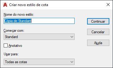 Nomeia o novo estilo de cota, define o estilo no qual iniciar um novo estilo e indica os tipos de cota aos quais você deseja que o novo estilo seja aplicado.