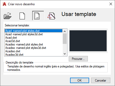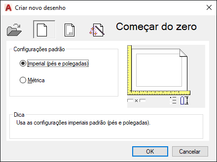 Start from Scratch cria um novo desenho com as configurações padrão imperial ou métrica. Use a Template cria um novo desenho com as configurações definidas em um template de desenho selecionado. Use a Wizard cria um novo desenho com as configurações especificadas no assistente Quick ou Advanced. (A primeira opção, Abrir um desenho, não fica disponível a partir do comando NOVO. Para abrir um desenho existente, utilize ABRIR.)