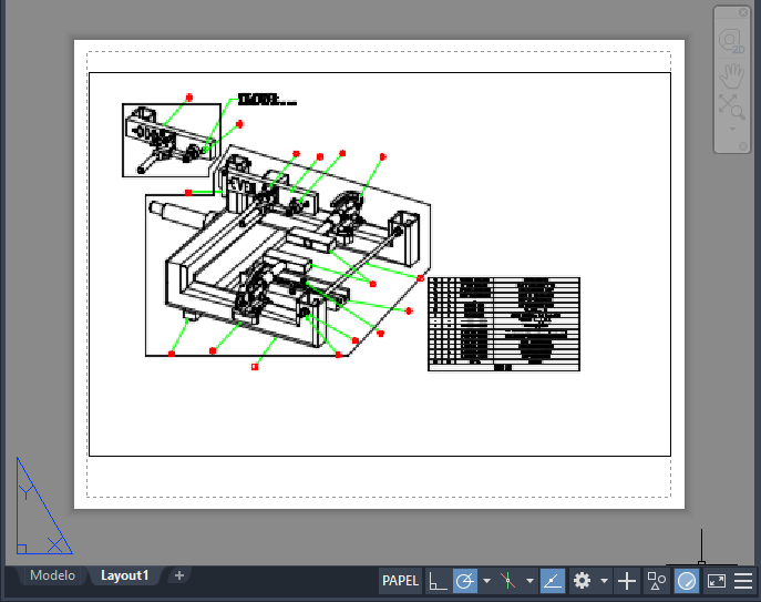 - Para preparar o desenho para impressão, alterne para o espaço do papel. Aqui é possível definir diferentes layouts com anotações e blocos da legenda. Em cada layout, é possível criar viewports de layout que exibem diferentes vistas do espaço do modelo. Nas viewports de layout, dimensione as vistas do espaço do modelo para o espaço do papel. Uma unidade em espaço do papel representa a distância real em uma folha de papel em milímetros ou polegadas, dependendo de como você define a configuração de página.