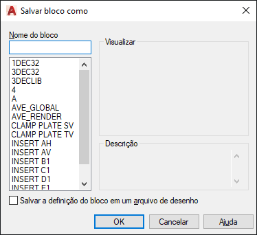 Salva a definição do bloco como um arquivo de desenho. A seleção de um arquivo de desenho pré-existente sobrescreve o arquivo salvo. Por padrão, o nome especificado do bloco é utilizado como o nome do arquivo de desenho.