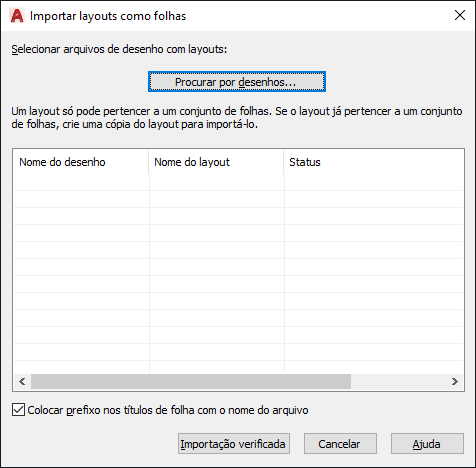 Relaciona todos os layouts no arquivo de desenho especificado. Clique em uma caixa de seleção para selecionar um layout.