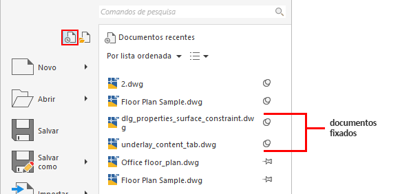 É possível manter um arquivo listado, independentemente dos arquivos que salvar posteriormente, ao clicar no botão de pino à direita do nome do arquivo. O arquivo é exibido na parte inferior da lista de documentos recentes até que se desative o botão de pino.