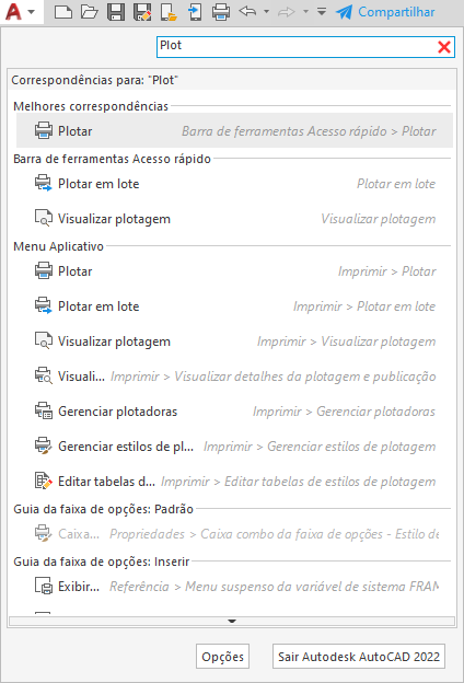 O campo de pesquisa de comando é exibido na parte superior do menu do aplicativo. Os resultados da procura podem incluir comandos de menu, dicas básicas de ferramentas e sequências de texto de prompt de comando. É possível inserir um termo de procura em qualquer idioma. Os resultados são aplicados ao espaço de trabalho atual.