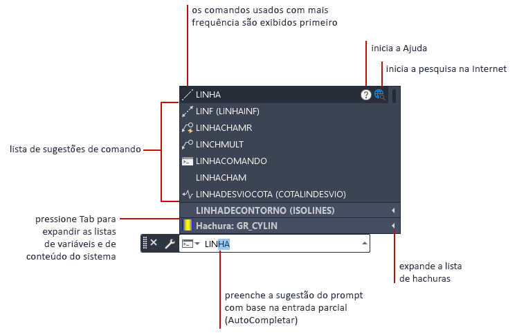 Uma lista dos comandos sugeridos é exibida assim que você insere as primeiras letras de um comando na janela de comando ou na caixa de entrada dinâmica. Por padrão, a lista tem as seguintes características: