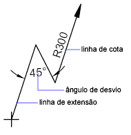 As linhas de desvio são com frequência adicionadas em cotas lineares quando a medição real não é representada de forma precisa pela cota. Normalmente, a medição real é menor do que o valor desejado.