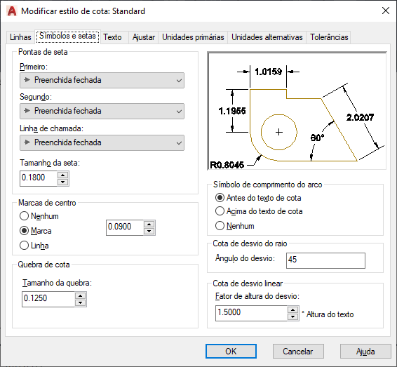Controla a exibição do símbolo do arco em uma cota de comprimento de arco. (variável de sistema DIMARCSYM)