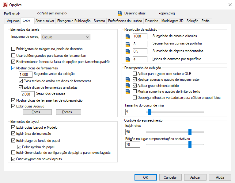 Controla configurações de exibição específicas para o ambiente de desenho.