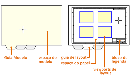 Você pode acessar um ou mais layouts a partir das guias localizadas no canto inferior esquerdo da área de desenho à direita da guia Modelo. É possível usar várias guias de layout para exibir os detalhes dos vários componentes do modelo em diferentes escalas e em diferentes tamanhos de folha.