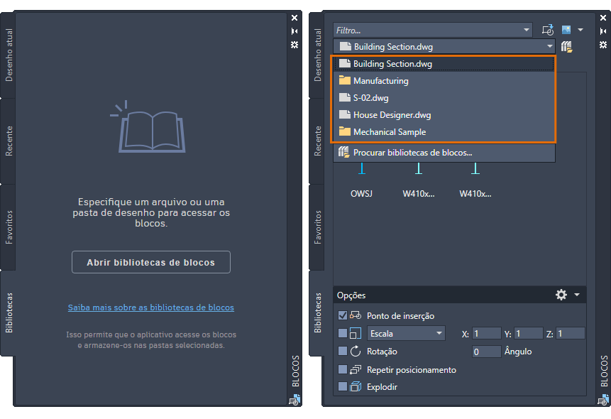 BLOCKNAVIGATE – Controla a pasta, o arquivo e os blocos que são exibidos na guia Bibliotecas da Paleta de blocos.