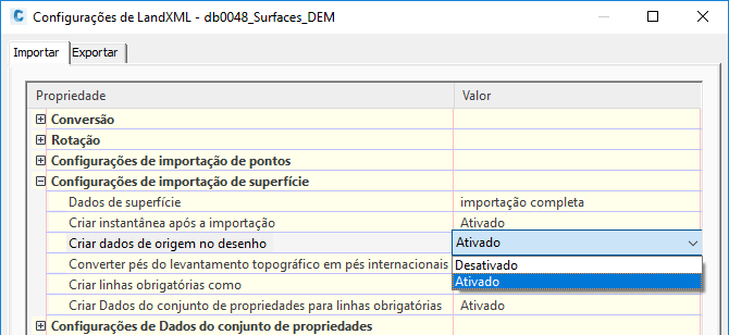 Figura 2: Configurações de importação de superfície do LandXML