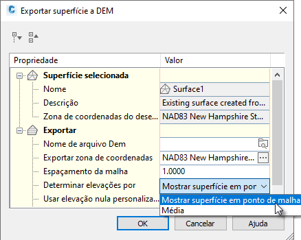 Uma configuração de exportação importante é o método para determinar a elevação em cada ponto. Você pode escolher experimentar a elevação da superfície no ponto da malha ou calcular a elevação média a partir dos pontos ao redor. O último método (média) é mais demorado. Para maior eficiência, utilize a opção de amostragem de superfície, como exibido na figura 4.