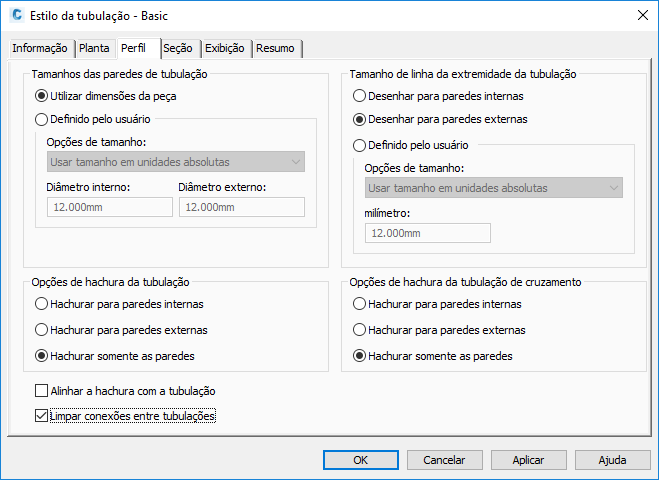 As seções de tubulação são desenhadas utilizando-se a variável de sistema FACETDEV (Facet Deviation). Esta variável controla a suavidade (suavização de serrilhado) de arestas curvas das tubulações nos gráficos de seção.