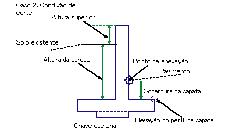 A altura da parede é determinada a partir da parte superior da sapata para ponto de anexação de elevação do solo na face vertical, o que for maior. Largura da sapata, deslocamento da face vertical da parede, chave cotas opcional, e a localização do centro da chave, são as funções da altura da parede.