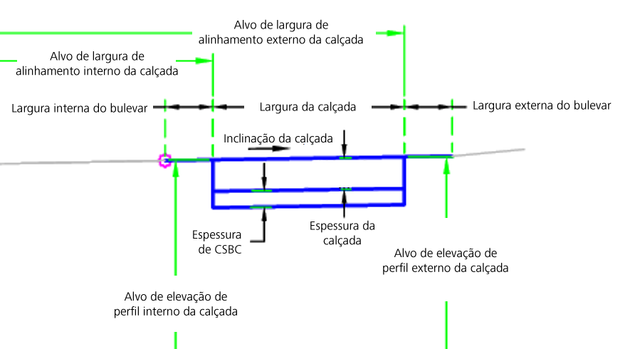 | Alinhamento externo da calçada | Pode ser utilizada para substituir a largura da calçada. Os seguintes tipos de objeto podem ser usados como alvos para especificar a largura: alinhamentos, polilinhas, linhas do recurso ou imagens do levantamento topográfico. | Opcional |