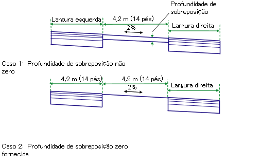As elevações nos pontos de inserção esquerdo e direito na existente são determinados, e a inclinação é calculada entre os dois pontos. Se uma profundidade de sobreposição não zero for fornecida, uma sobreposição de camada é adicionada acima da pista existente e na inclinação calculada. Uma forma de sobreposição fechada é criada ao substituir um ou mais vínculos acima da declividade existente. As pistas de alargamento são inseridas para fora das bordas de sobreposição as larguras determinadas na inclinação calculada.