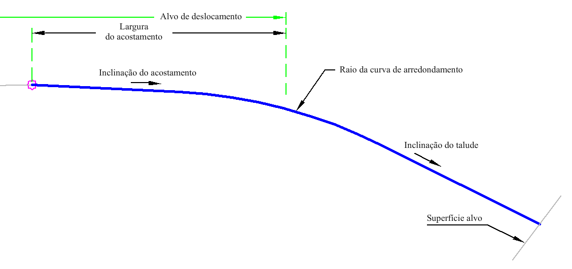 O acostamento é medido desde o ponto de anexação até o PVI do arredondamento. Se a distância entre o PVI e a superfície de destino não for adequada para fornecer o arredondamento da curva, o valor da curva de arredondamento é reduzido para caber. Você pode definir a geometria do acostamento arredondado.
