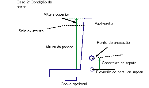 O ponto de anexação varia caso o muro de arrimo esteja na condição de corte ou preenchimento. Se estiver em aterro, o ponto de anexação estará perto da parte superior da parede de retenção. O ponto de anexação estará perto da sapata se esta estiver inserida na condição de corte.