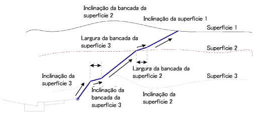 Na situação aterrar, o vínculo de talude e inserido com a inclinação baseada no parâmetro de entrada da inclinação de aterro para a superfície 1. No corte, a submontagem primeiro verifica para determinar se ele está abaixo da superfície 3 aplicando a inclinação à superfície 3, e verificação de intersecção. Este processo é repetido para cada superfície adicional. Opcionalmente, as transições entre as superfícies opcionais podem ser adicionados às mudanças de superfície. A largura e inclinação de banco para a superfície que acabou de ser interceptada serão usadas.