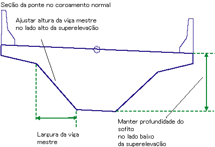 A submontagem constrói os vínculos para o deck da ponte e para a subestrutura com base nos valores dos parâmetro de entrada fornecidos. Em superelevação, nem toda a estrutura é rotacionada. Ä profundidade do sofito é mantida para o valor da parte superior da borda do deck no lado baixo da ponte, e a altura da viga mestra é ajustado no lado alto para a raiz do deck.